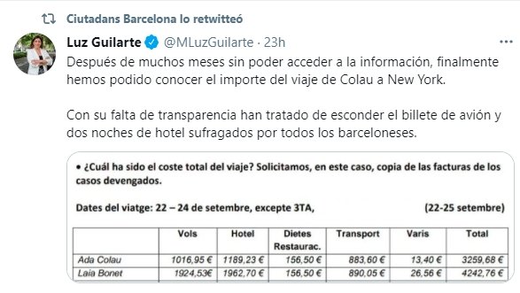 El viaje de la alcaldesa de Barcelona, Ada Colau, y parte de su equipo a Nueva York en septiembre de 2019 para participar en la Cumbre Climática organizada por Naciones Unidas costó a las arcas municipales un total de 26.079,46 euros. Las cifras han sido facilitadas por el grupo municipal de Cs, que hace cerca de año y medio solicitó conocer los detalles sobre el viaje y que no ha obtenido respuesta hasta este mes, después de que el grupo denunciara las trabas para acceder a la información.