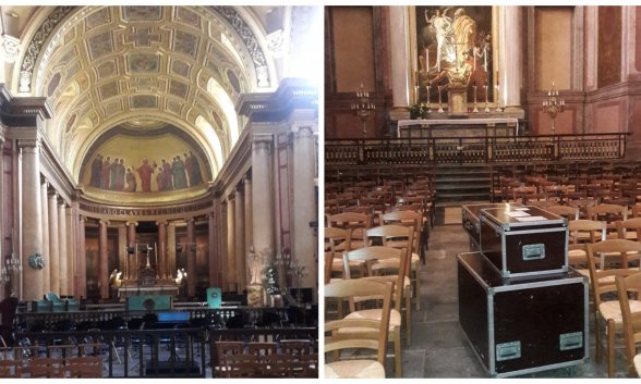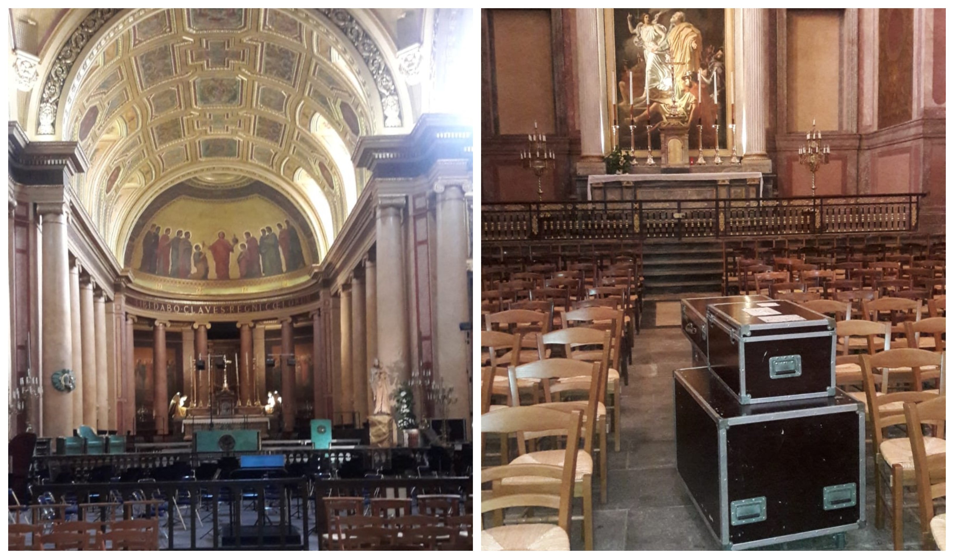 Esa foto que ustedes están viendo corresponde a la capilla del Santísimo de la Catedral de Rennes, capital de la Bretaña francesa. Al fondo, el Santísimo, delante, en el pasillo central (total, nadie va a visitar al Señor de la casa) aparecen las maletas de los músicos que utilizan el altar mayor como escenario.