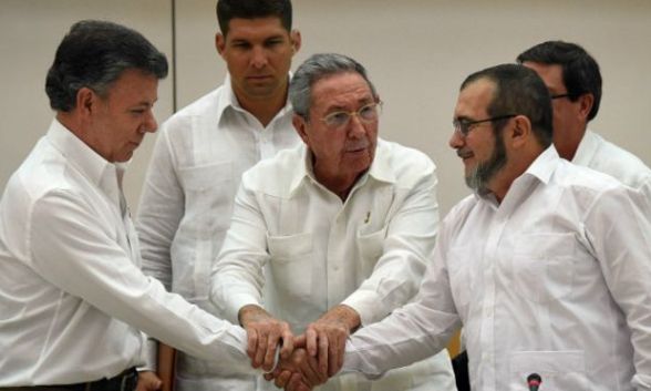 Raúl Castro (los tres en la imagen), un acuerdo sobre la justicia transicional y se dieron seis meses para firmar el acuerdo de paz definitivo, es decir, hasta el próximo 23 de marzo.El acuerdo es el último punto de una negociación que