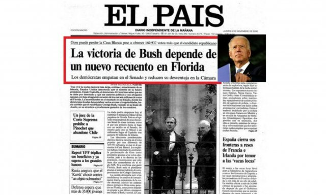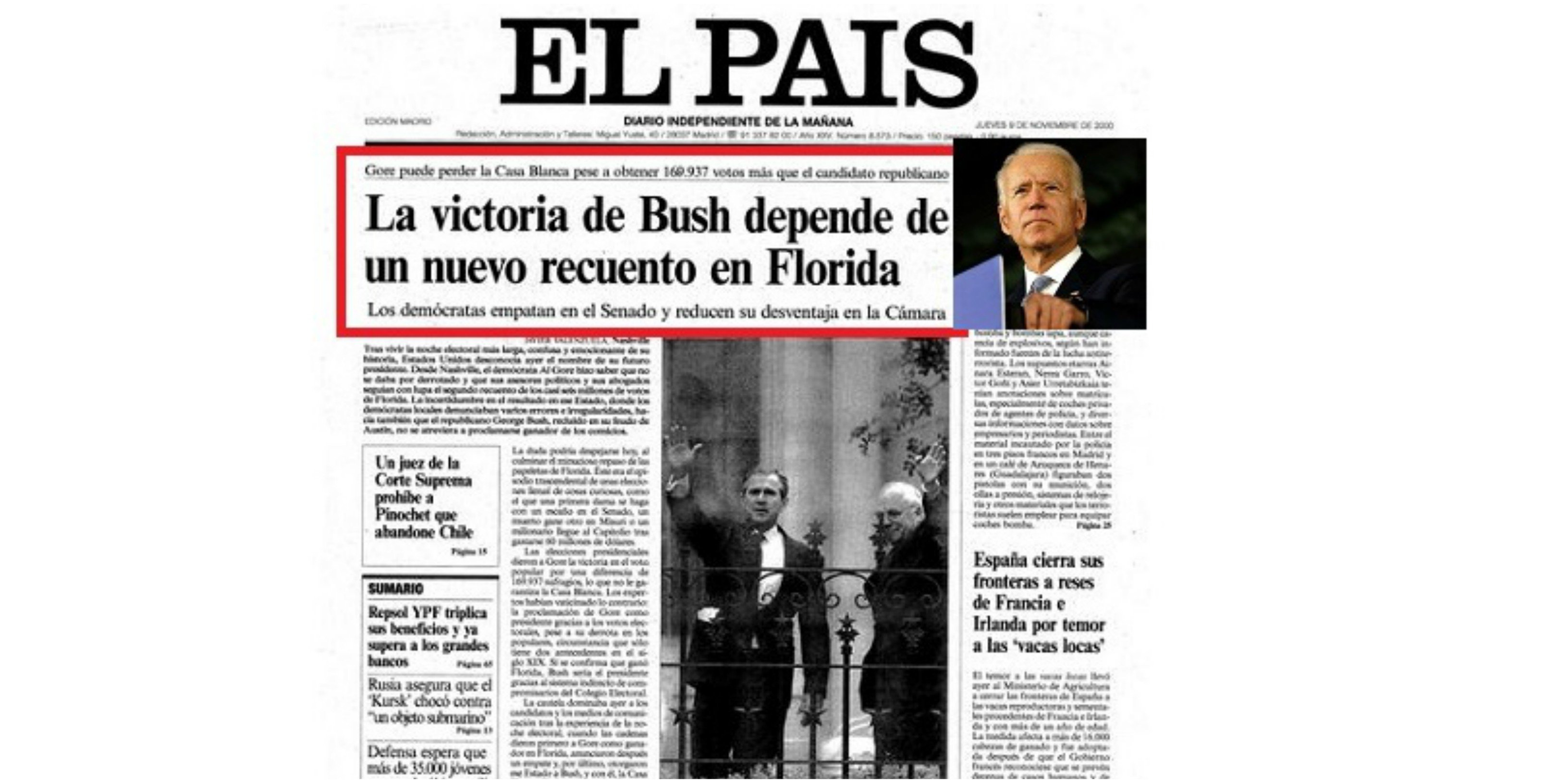 Por supuesto, no duden que los medios de comunicación no sólo no informarán sobre los cientos de acusaciones de fraude electoral, sino que además continuarán censurando y persiguiendo a todo aquel que se atreva a denunciarlo. En concreto, El País ha vuelto a hablar de los bulos a favor de Trump. Era el mismo periódico que alentaba a Al Gore a llevar a los tribunales el presunto pucherazo de George Bush.
