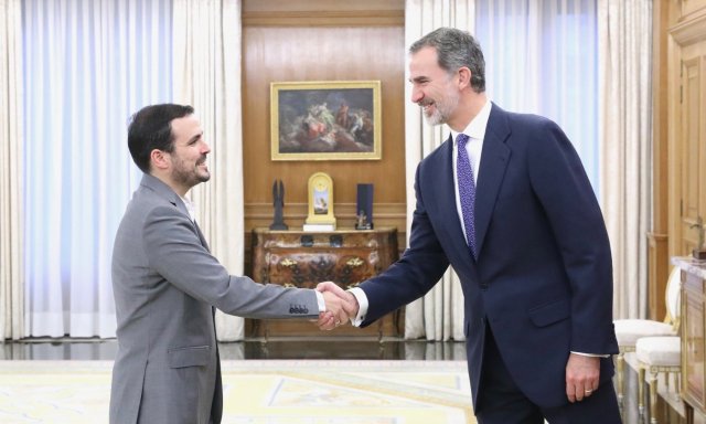 El comunista Alberto Garzón ha trasladado al Rey -al "ciudadano Felipe de Borbón", según él- su "anhelo" de que el acuerdo firmado entre el PSOE y Unidas Podemos "pueda llegar a buen puerto", aunque para eso todavía quedan "una serie de flecos" como la negociación con ERC. El líder de Izquierda Unida ha trasladado también al rey que consideran la vía del Gobierno de PSOE con Unidas Podemos es "una vía de esperanza para mejorar la vida de las familias trabajadoras y la única que puede empezar a resolver el conflicto territorial en nuestro país".
