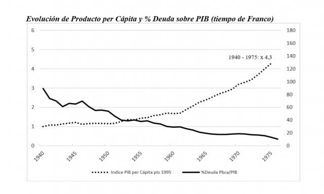 Pues bien, dice José Antonio Santos que si comparamos la economía durante el franquismo (1940-1975) con la economía durante la etapa democrática, Franco sale ganando por goleada. Así, en 1940 la deuda pública española superaba el 90% pero en 1975 había caído hasta el 10%. Y lo malo es que en 2019 nos asfixia una deuda pública que roza el 100%. Cada españolito que viene al mundo es un moroso incapaz de amortizar la deuda que le han endosado sus padres. Y eso, sin hablar de las dos Españas. Basta la deuda por satisfacer para helarle el corazón.