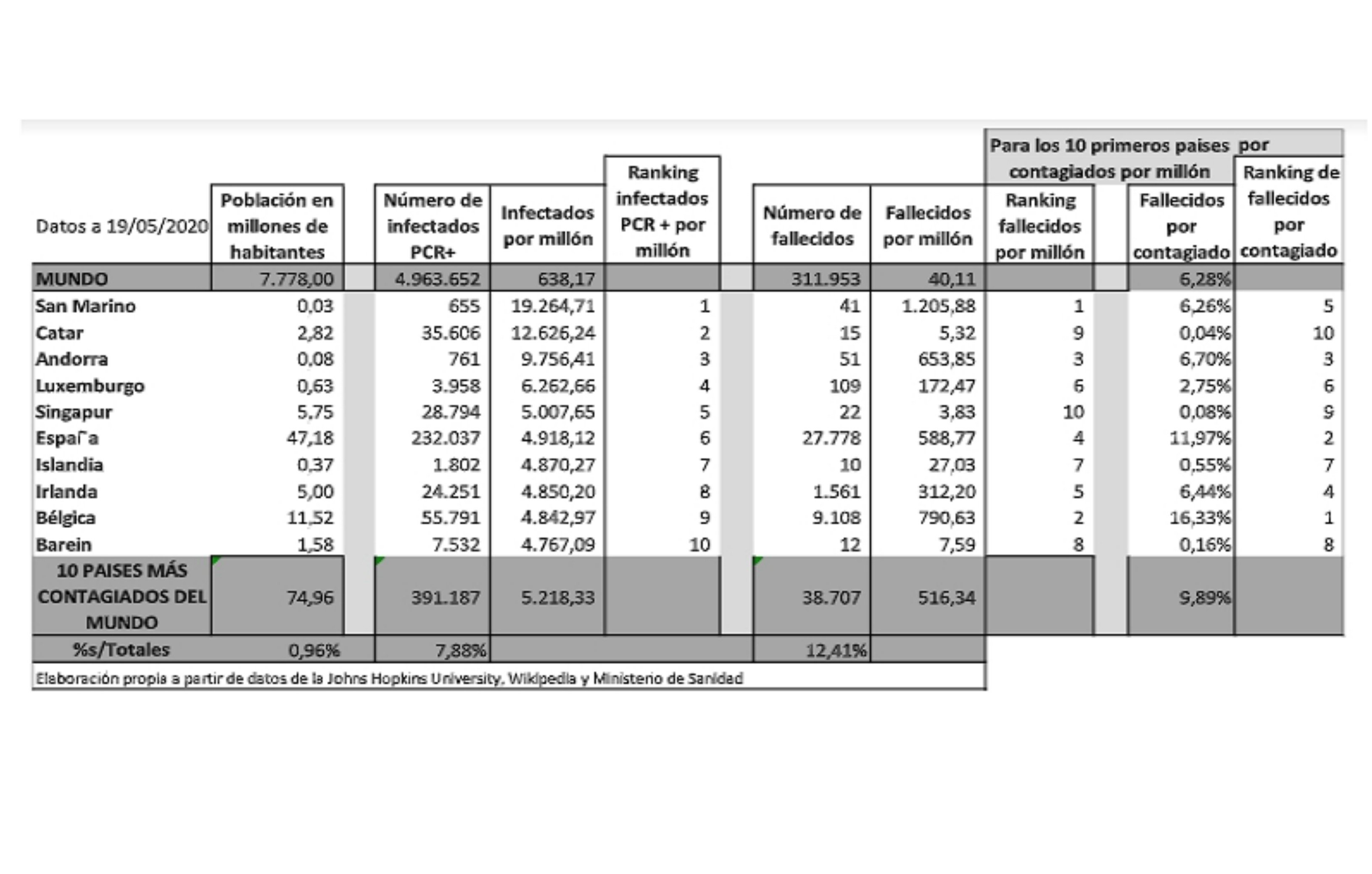 Y no le falta razón a don Pablo, porque en los rankings que se hacen desde distintas fuentes y que Hispanidad ha venido publicando, en aquellos que dan a España la desgraciada medalla de oro de ser el epicentro mundial del coronavirus, se están despreciando los datos de los pequeños países.