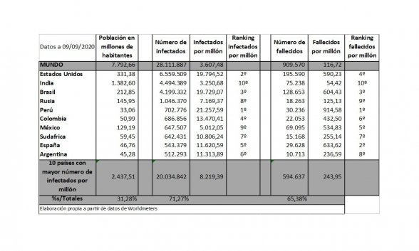 Pero vamos a recuperar nuestras viejas comparativas. Aquí los diez países con más contagiados del mundo. Representan un tercio de la población mundial, más del 70% de los infectados y dos tercios de los fallecidos.