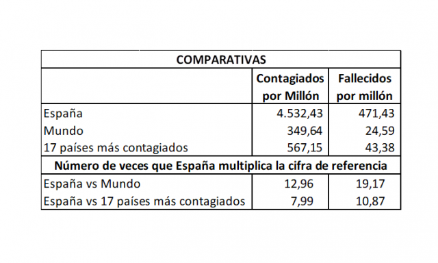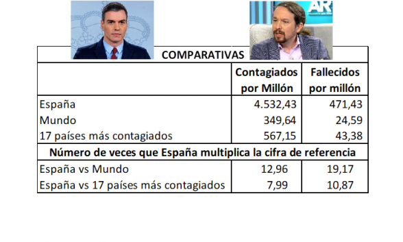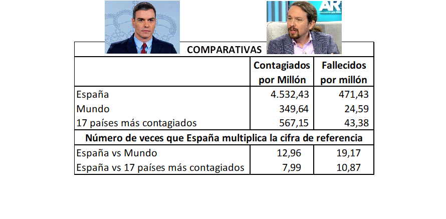 En donde no somos tan malos es en la relación entre contagiados y fallecidos, aunque estamos por encima de la media. Por tanto, la conclusión es clara: los medios españoles no lo están haciendo mal, a pesar de los escasos medios que les han proporcionado pero el Gobierno de Pedro Sánchez no lo ha podido hacer peor.
