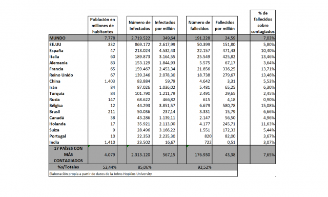 Seguimos con las cifras facilitadas por un centro de análisis imparcial y de prestigio: ahí tienen los cuadros de la Johns Hopkins University, y la conclusión es la misma que lleva siendo desde hace tres semanas: España es el país con más infectados por coronavirus del mundo y con más fallecidos del mundo, medido sobre cada millón de habitantes. En fallecidos sólo nos supera Bélgica, pero sólo porque ha cambiado su forma de cómputo.