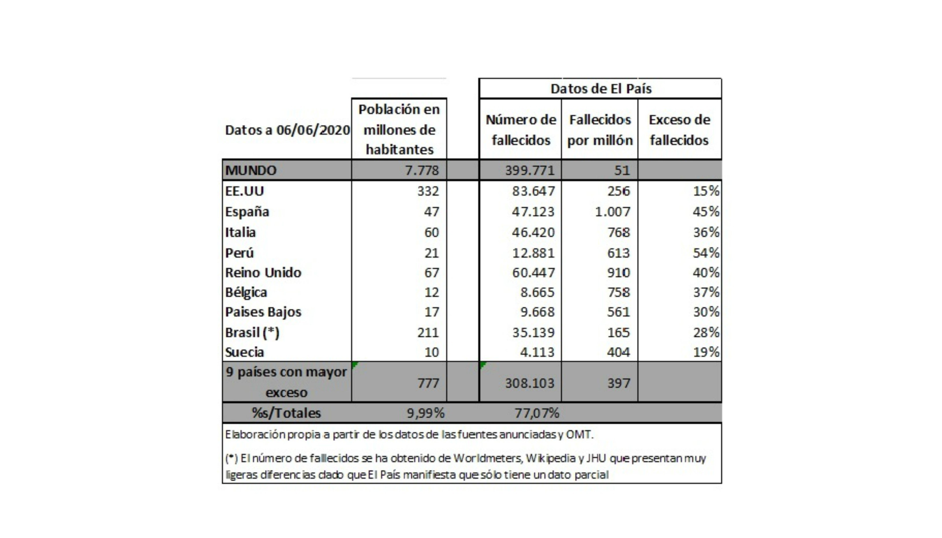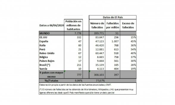 Pero como no puede dejar de ser fiel a su independencia de la verdad, titula que España es el segundo país del mundo con mayor exceso de fallecidos durante la crisis, lo que, no siendo falso, oculta el hecho más relevante que el propio diario publica en la tabla que adjunta al artículo: España es el país con el mayor número de fallecidos por millón del mundo (excepción hecha de algunos pequeños territorios, como San Marino). España, según muestra El País, ha superado ya la barrera de los 1.000 muertos por millón de habitantes, en concreto 1.007.