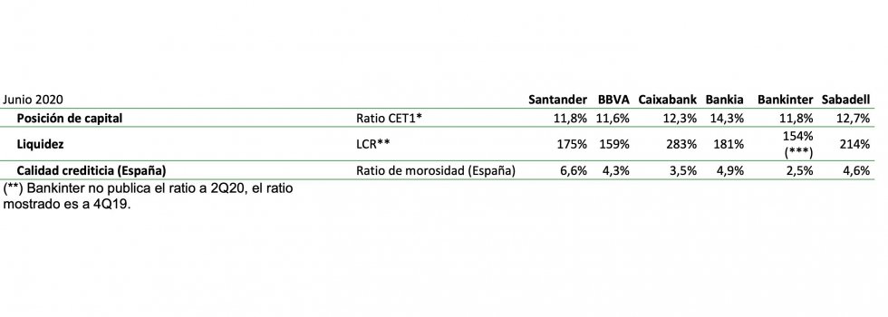 Y si nos ceñimos a la liquidez, BBVA y Santander vuelven a repetir como los peor situados. El banco que preside Carlos Torres cerró junio con un ratio de liquidez del 159%, seguido del Santander, con un 175%. Bankia (181%), Sabadell (214%) y Caixabank (283%) completan el ranking (el dato de Bankinter corresponde a diciembre de 2019).