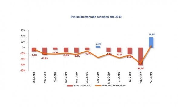 El canal de empresas y el de alquiladoras han logrado amortiguar los descensos de ventas acumulados en el último año (subidas del 121,2%, hasta 5.635 vehículos, y del 30,6%, a 35.223 unidades, en el noveno mes, respectivamente). Mientras que el de particulares se ha mantenido a la baja: las matriculaciones sólo han aumentado un 3,3%, alcanzando los 40.893 vehículos. En el conjunto de los nueve primeros meses, las ventas siguen estando en negativo (-7,4%), contabilizando 965.339 unidades, con descensos en los tres canales citados (del 2,1%, 2,6% y 12,9%, respectivamente).