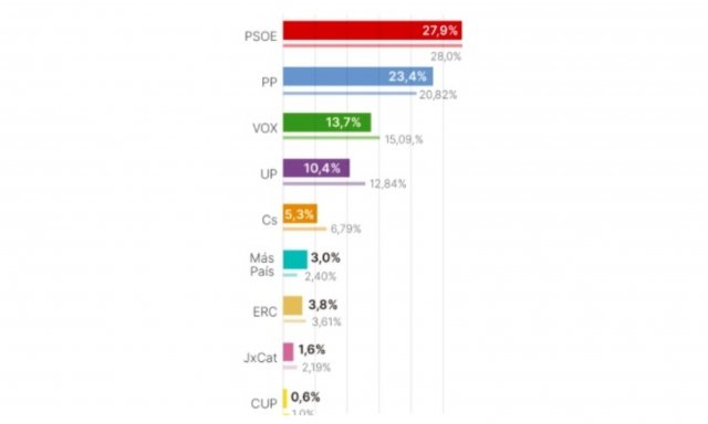 Primero, recordemos los resultados de las últimas elecciones generales de noviembre de 2019: el PSOE sacó 120 escaños y el 28% de los votos. El PP, 89 y el 20,8%. Vox, 52 y el 15,1%. Podemos, 35 y el 12,8%. Y Ciudadanos, 10 y el 6,8%.