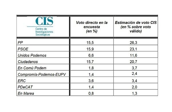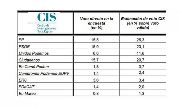 intención de voto (voto directo, o sea, respuesta espontánea del encuestado).Ciudadanos ha subido más de tres puntos en estimación de voto, situándose en el