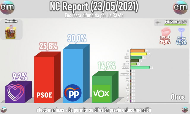 Según una encuesta de NC Report para La Razón publicada hoy, el PP obtendría el 30% de los votos y 127-129 escaños. El PSOE sacaría el 25,8% de los votos y 100-102 escaños. Vox sacaría el 14,9% y 48-50 escaños. Unidas Podemos, el 9,2% y 19-21 escaños. Más País, el 3,9% y 4-6 escaños. Y Ciudadanos, el 2,9% y entre uno y dos escaños.