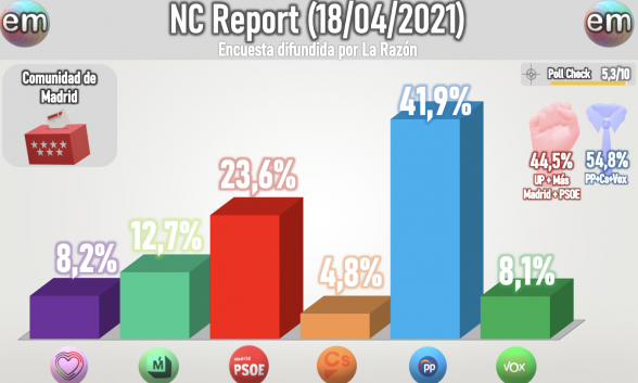Hoy, según una encuesta de NC Report para La Razón, el PP obtendría el 41,9% de los votos y 61 escaños. El PSOE sacaría el 23,6% de los votos y 34 escaños. Más Madrid se haría con el 12,7% de los votos y 18 escaños. Vox tendría el 8,1% de los votos y 12 escaños. Y Unidas Podemos sacaría el 8,2% de los votos y 12 escaños.