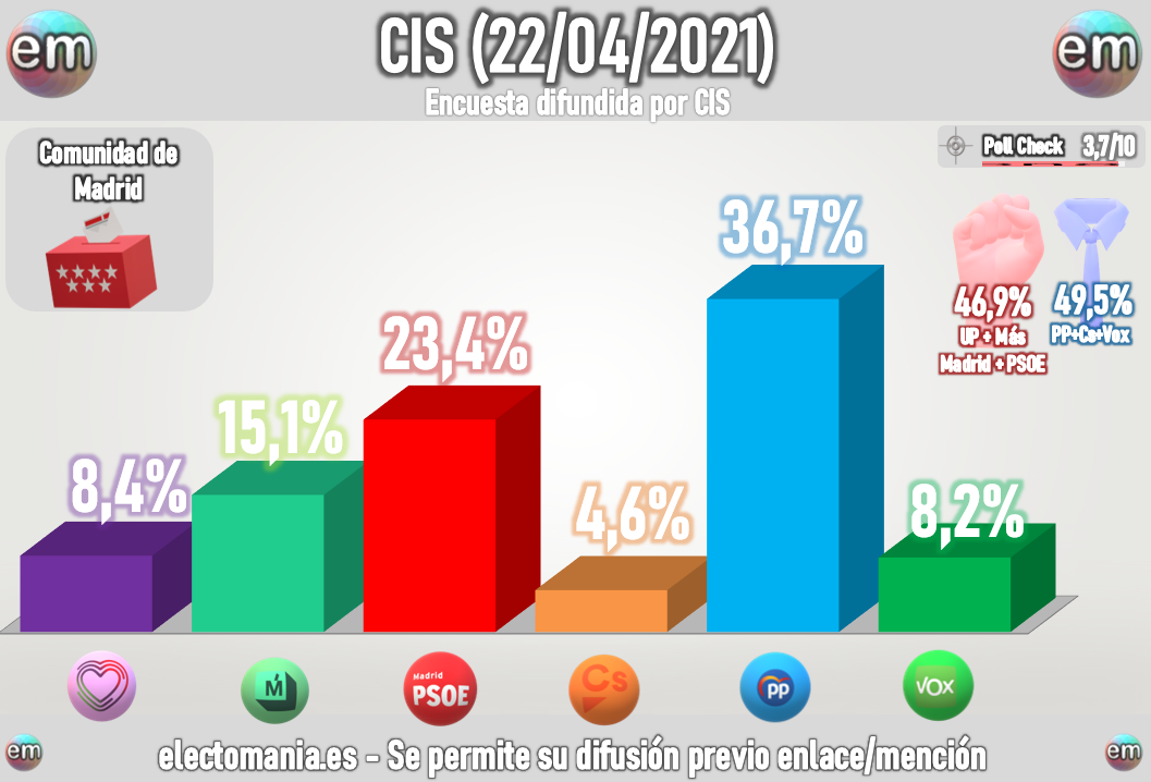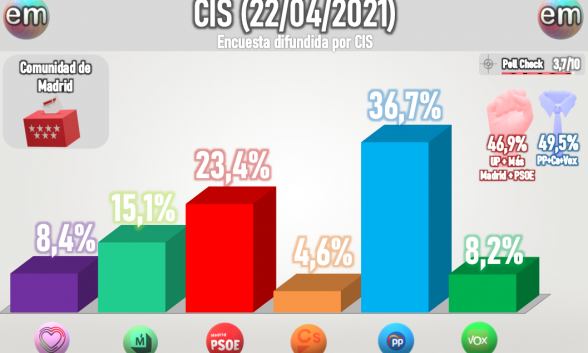 Pues bien: el último CIS del socialista José Félix Tezanos sobre intención de voto en Madrid otorga al PSOE una horquilla de entre 34 y 36 escaños y un 23,4% de los votos