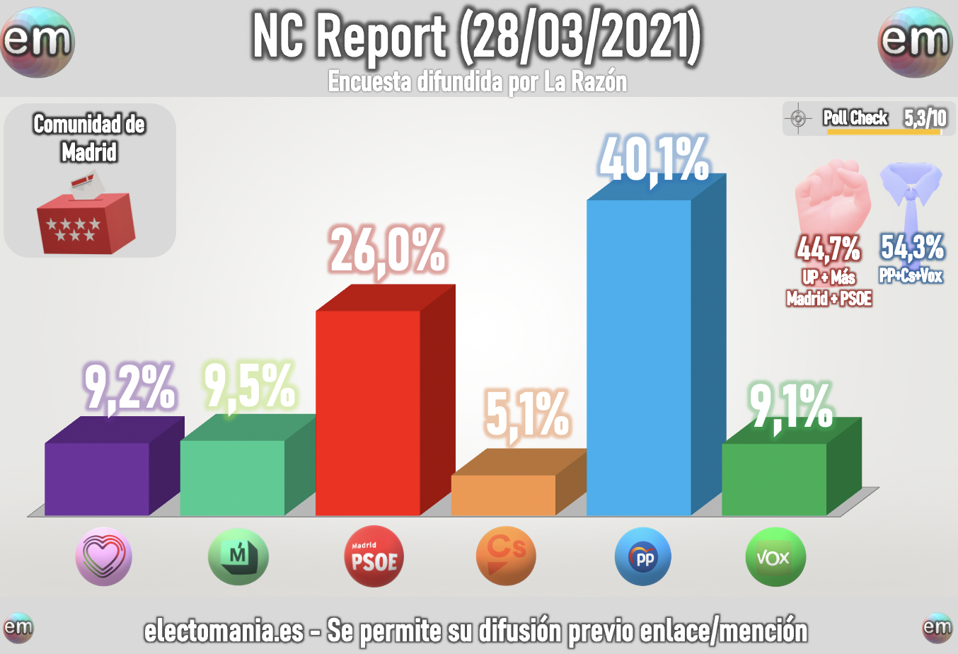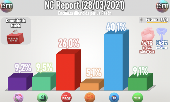 Pues bien: según una encuesta de NC Report para La Razón, el PP se haría con el 40,1% de los votos y 56 escaños.