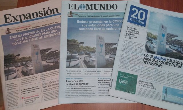 Entre esas “soluciones”, Endesa también ha mencionado unas inversiones de 3.800 millones de euros en renovables y que ha recibido el primer crédito verde del ICO (300 millones) para fomentar la producción con renovables. Además, está el ‘Programa Endesa Educa’ con el que ha enseñado a más de 58.000 alumnos a ser eficientes y el lanzamiento del prototipo del primer autobús eléctrico con sistema de carga a través del suelo junto con Alstom y Mansel. Y por si todo esto no fuera suficiente, la compañía señala en la parte interior de las portadas y las contraportadas de prensa que está "con los objetivos de la COP25 hoy y todos los días" y ofrece una serie de consejos porque "la sostenibilidad empieza por los pequeños gestos".