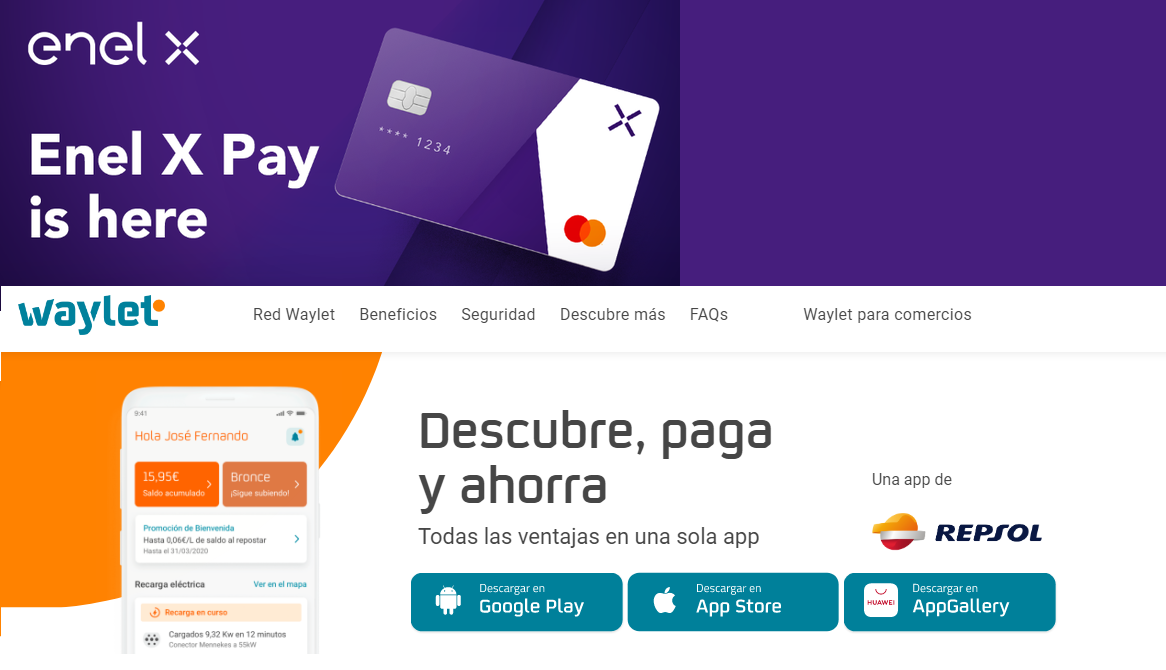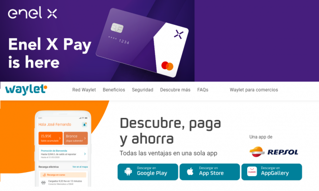 En España, Repsol ofrece una aplicación de pago denominada Waylet para usar en sus estaciones de servicio y en algunos comercios (El Corte Inglés, Federópticos, entre otros), y a través de la que ofrece descuentos y promociones. Por ahora, Iberdrola y Naturgy no tienen planes de entrar en el sector de las finanzas a corto plazo, aunque la eléctrica que preside Ignacio S. Galán sí permite el pago online de sus facturas: basta tener una tarjeta de débito o crédito y conexión a Internet.
