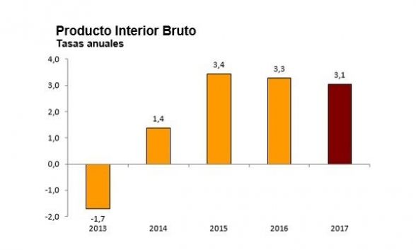 - El PIB sube un 3,1% en 2017, dos décimas menos que en 2016, según confirma el INE.