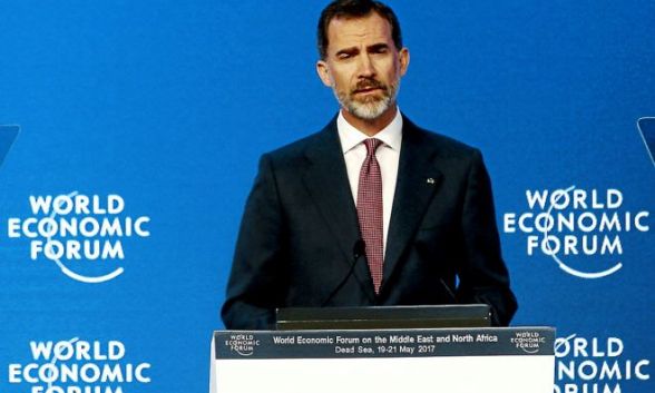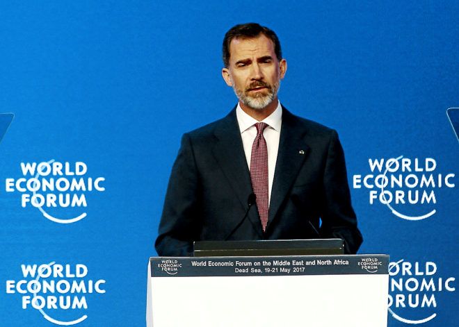 El Rey de España Felipe VI ha participado hoy miércoles en Davos. Su intervención tenía como finalidad intentar atajar la incertidumbre en torno a la situación en Cataluña, que el pasado lunes dejó patente el Fondo Monetario Internacional (FMI) al rebajar las previsiones de crecimiento de la economía española por ese motivo.Pues bien: el monarca español ha asegurado que en