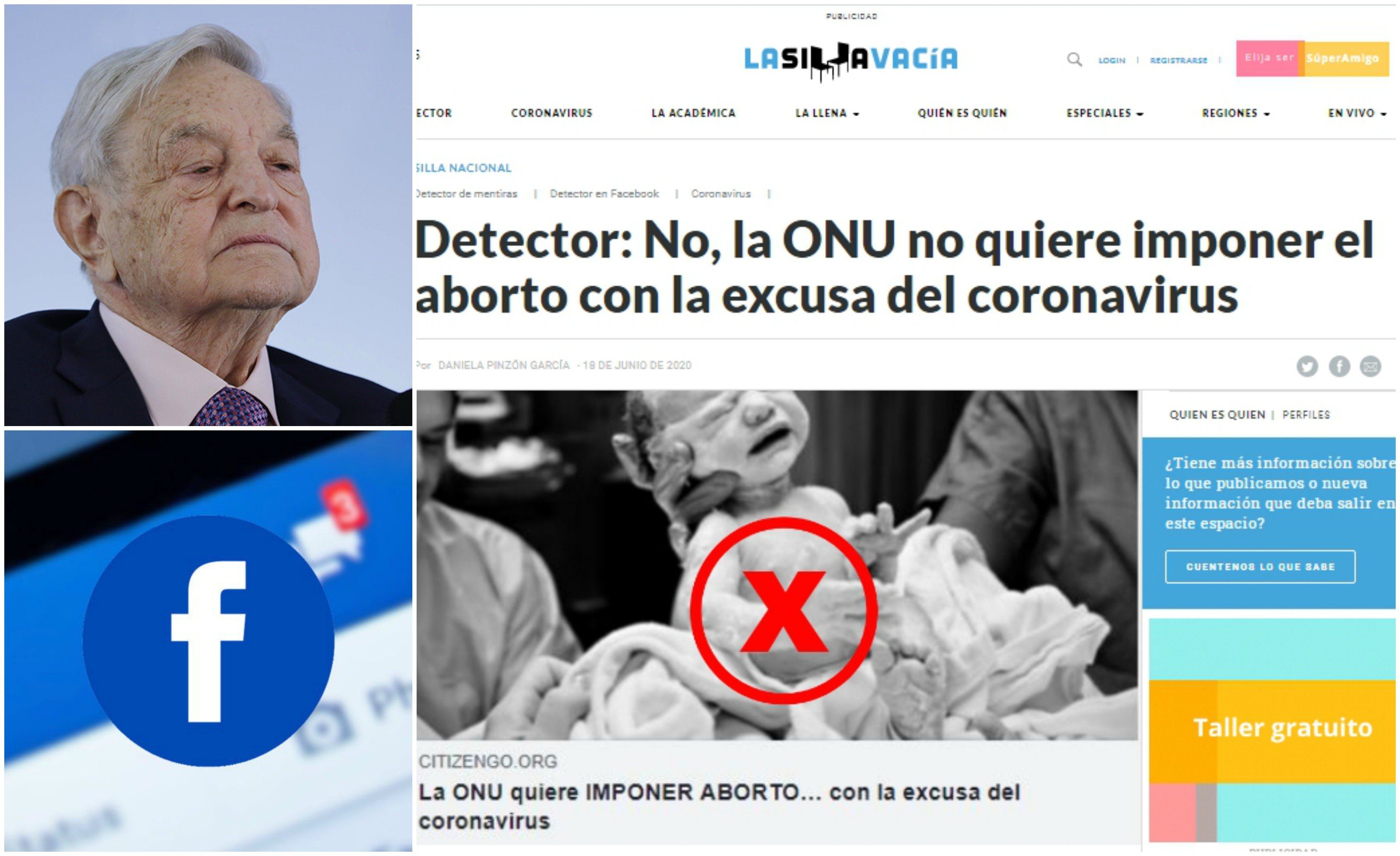 Al compartir la campaña de CitizenGO, Facebook inserta sobre el enlace el mensaje “Información falsa. Comprobado por verificadores de información independientes”, remitiendo a un artículo del sitio web colombiano “La Silla Vacía”, que surgió gracias a capital de George Soros, conocido promotor del aborto a nivel mundial.
