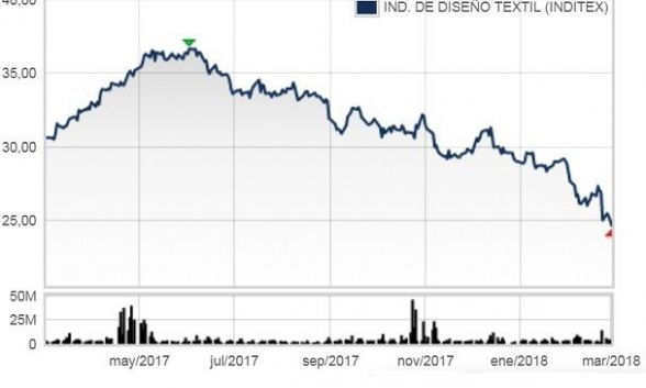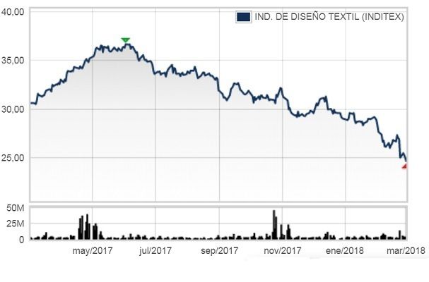 - La acción de Inditex lleva tiempo a la baja, alejándose del máximo (36,66 euros) logrado el pasado 2 de junio.