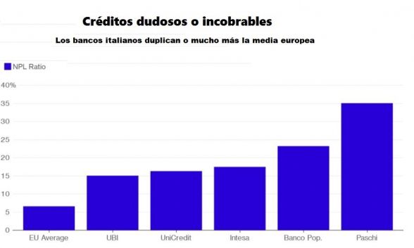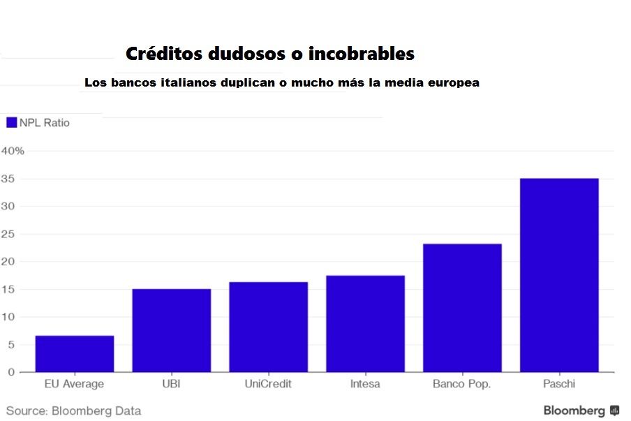 Bloomberg, advertirán sin excesiva audacia lo poco que representa esa cantidad, no sólo en comparación de la cartera de créditos dudosos o incobrables de Intesa Sanpaolo, sino también respecto a otros bancos italianos. La medida de las principales entidades transalpinas supera ampliamente más del doble de la medida en Europa.Eso sin tener en cuenta la cifra total del sector, que eleva a 360.000 millones los