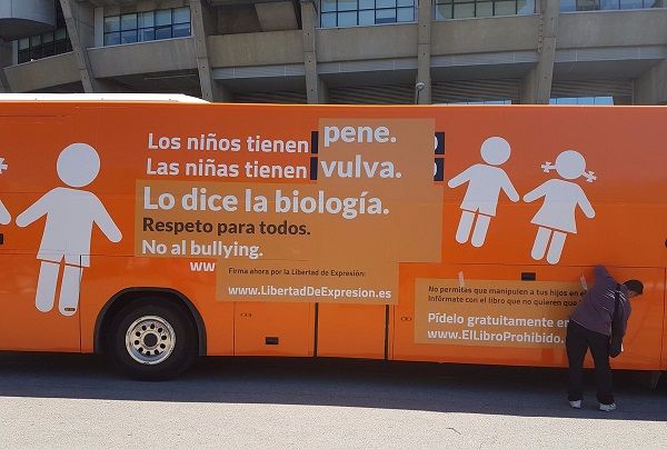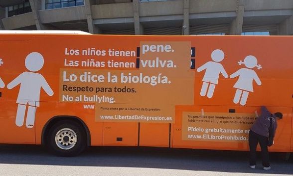 "Los niños tienen pene. Las niñas tienen vulva. Lo dice la Biología. Respeto para todos, no al bullying". Pero el nuevo autobús no limitará su recorrido a Madrid, "si Dios quiere" el viernes estará en Barcelona, según ha señalado