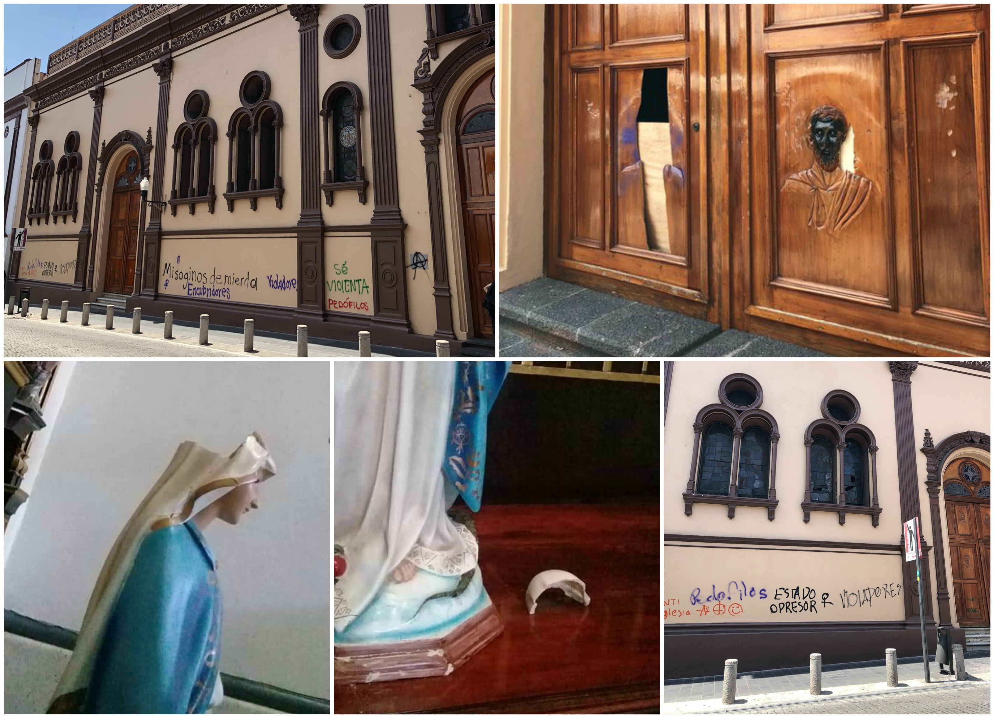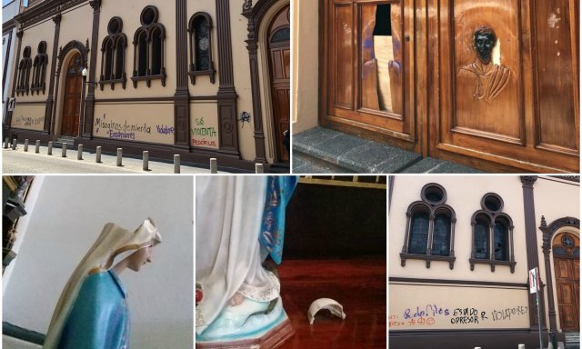 Entre los mensajes que pintaron en los templos católicos se puede leer “pedófilos”, “estado opresor”, “violadores” y “guerra al estado y al capital”. Una imagen de la Virgen María fue dañada dentro de 'El Beateri'”.