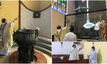 En la ceremonia, transmitida en vivo a través de las rede sociales, el P. Suárez purificó el altar del templo, así como sus paredes y el Sagrario.
