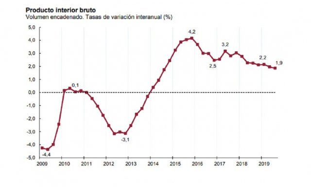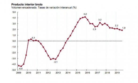 El PIB creció un 1,9% en el tercer trimestre respecto al mismo trimestre del año anterior, según la Contabilidad Nacional publicada este lunes por el Instituto Nacional de Estadística (INE). Este dato significa una décima menos que en el segundo trimestre y también una décima menos que lo avanzado por Estadística, que había estimado un crecimiento del 2%.