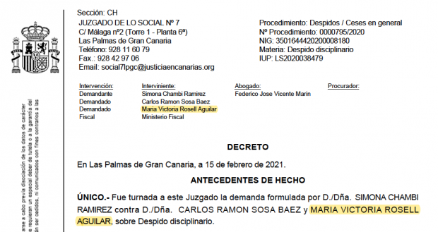 Victoría Rosell cuya trayectoria ha estado plagada de escándalos. En las Palmas, como titular del juzgado numero 8 de Las Palmas, la pareja de Rosell cerró un negocio al que ella pudo favorecer como jueza. La Fiscalía abría poco después diligencias para comprobar si, durante su etapa , en efecto retrasó «maliciosamente» una investigación para favorecer a su pareja, según recogía ABC. La reacción de Rosell fue la de acusar al exministro de Industria, José Manuel Soria, de «estar detrás de la Fiscalía». Este se querelló por injurias y calumnias en un juzgado de Madrid, y luego amplió su denuncia a otros tres delitos relacionados con la sospecha.