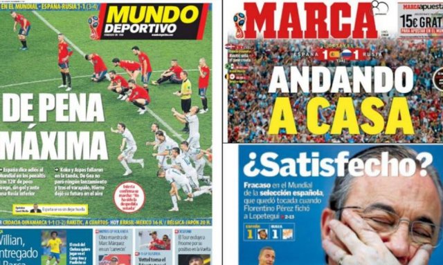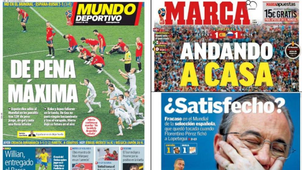 'Marca' afirma en portada: "La España de antes", en alusión a los reveses de La Roja en el pasado, y bajo el apunte "Un fracaso con mayúscula", dice: "Todo se acaba. La edad dorada comenzó en el punto de penalti, con una tanda mágica ante Italia, y ahí finalizó, con una tómbola trágica ante Rusia (...). Fue el punto y final a un Mundial disparatado desde el despido de Lopetegui. España hizo todo lo posible por aliarse con el caos".