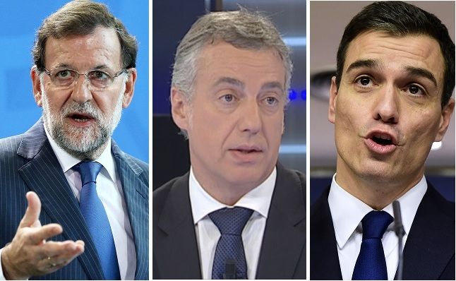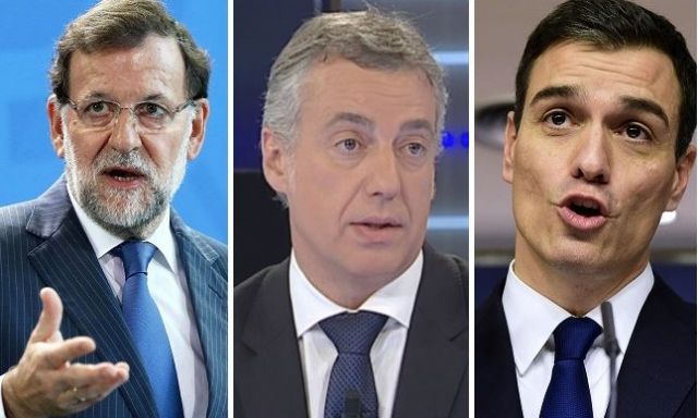 en el centro de la imagen, con Sánchez a la derercha y Rajoy a su izquierda), el pasado domingo 24, en Vitoria, ha sentado ligeramente mal en Moncloa. No por sus referencias a un referéndum como los de "Quebec o Escocia", porque eso forma parte del santoral laico del PNV, no por lo de una "Euskadi co-soberana en una Europa Confederal", porque eso forma parte de la muy laica