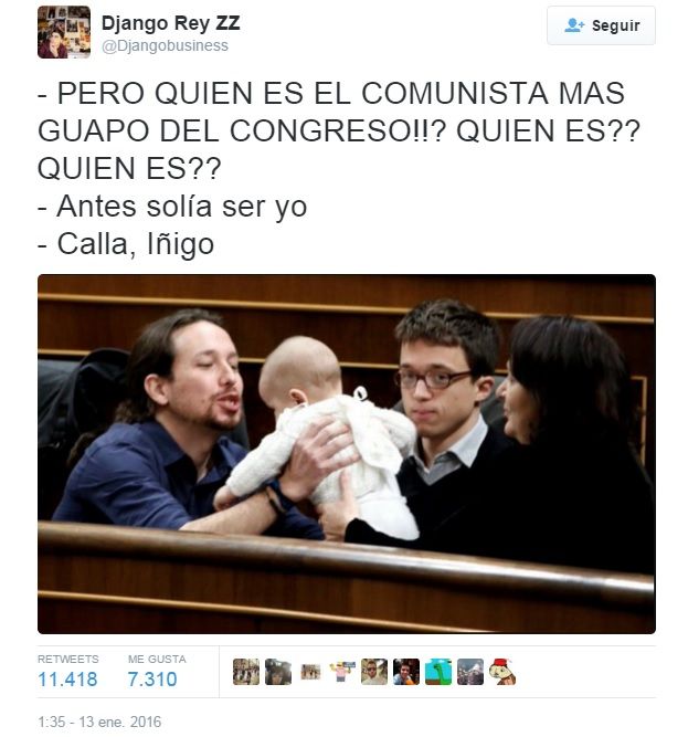 Carolina Bescansa. Como bien saben, ella fue una de las protagonistas del 'circo', pues no dejó a nadie indiferente al llevar a su bebé de seis meses al hemiciclo, en vez de a la guardería del Congreso. Algo inédito que fue, sin duda, el tema más comentado y provocó un aluvión de mensajes en las redes sociales (entre ellos, los que referían los supuestos 'celos' de Íñigo Errejón, como el de la imagen).Claro que Sánchez no sólo quiere pactar con Podemos, también aspira a lograr el apoyo de