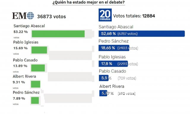 El diario 20 Minutos también ha lanzado una encuesta que responde a la misma pregunta que la de El Mundo. Con un total de 12.884 votos a la hora de escribir estas líneas, Santiago Abascal encabezaba la lista con el 52,68% de los sufragios, seguido por Pedro Sánchez (18,65%), a quien pisaba los talones Pablo Iglesias (17,8%) y, con algo más de distancia, se encontraban Pablo Casado (5,5%) y Albert Rivera (5,37%).