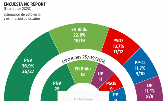 Según una encuesta de NC Report para LA RAZÓN sobre las elecciones en el País Vasco del próximo 5 de abril, el PNV lograría el 36,9% de los votos y entre 26 y 27 escaños, frente a los 28 que obtuvo en septiembre de 2016. Por su parte, EH Bildu sacaría el 22,8% de los votos y entre 18 y 19 escaños, frente a los 18 que sacó en septiembre de 2016. El PSOE se quedaría con el 13,7% del electorado, lo que le permitiría lograr entre 11 y 12 escaños, frente a los 9 que tuvo en septiembre de 2016. La coalición PP-Ciudadanos se haría con el 11,7% de los votos, y entre nueve y diez escaños, frente a los 9 que logró en septiembre de 2016. Y Unidas Podemos obtendría el 11,1% de los votos y entre ocho y nueve escaños, frente a los 11 de septiembre de 2016.