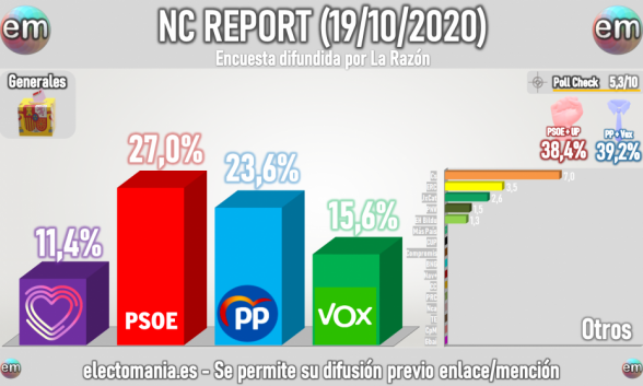 Según la última encuesta de NC Report para La Razón, el PSOE obtendría entre 114-115 escaños (27% de votos). PP 98-99 escaños (23,6% de votos). Vox 53-54 (15,6% de votos). UP 27-28 (11,4% de votos). Cs 9-10 (7% de votos).