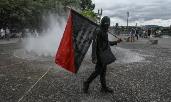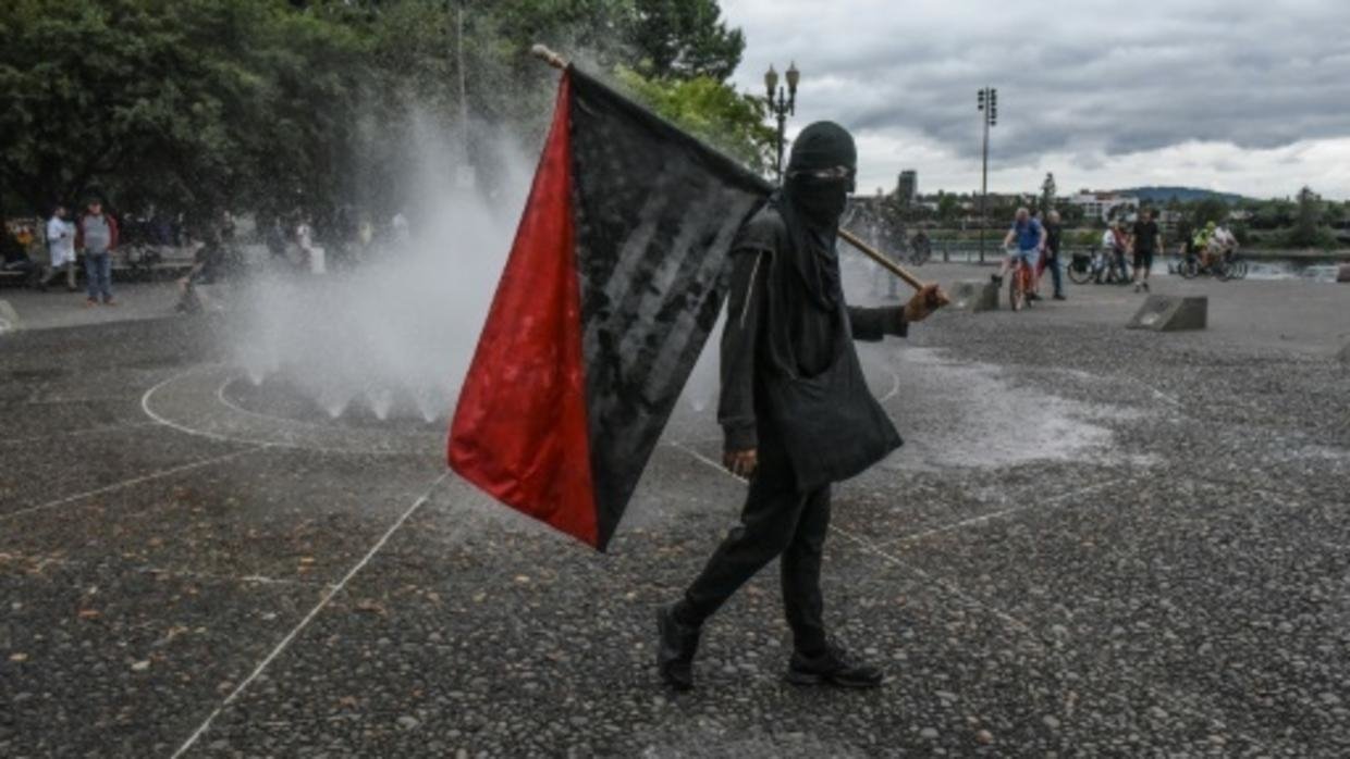 Los simpatizantes de Antifa utilizan una bandera con los colores rojo y negro y el lema Acción Antifascista. Ante la ola de protestas desatada por el asesinato de Floyd, autoridades han detectado a presuntos miembros de dicha organización entre los participantes de las marchas más violentas, que han terminado en saqueos de tiendas y quemas de patrullas.