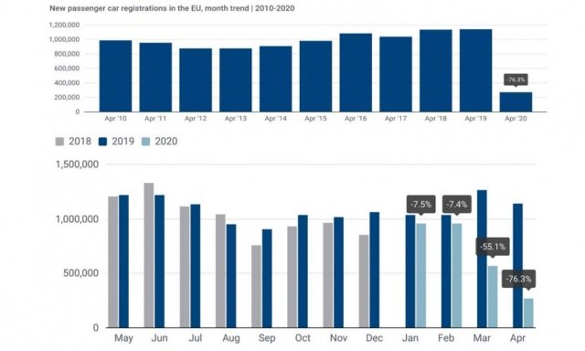 La venta de coches se ha desplomado un 76,3% en la Unión Europea en abril por el coronavirus, situándose en un mínimo histórico de 270.682 unidades, según los datos de la Asociación Europea de Fabricantes de Automóviles (ACEA). Y la pandemia ha provocado una pérdida de producción de 2,17 millones de vehículos hasta el momento debido a la parada de las fábricas.