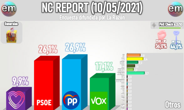 Según una encuesta de NC Report para La Razón, el PP sacaría el 26,9% de los votos y 109-11 escaños. El PSOE obtendría el 26,1% y 106-108 escaños. Vox se haría con el 17,1% y 59-61 escaños. Unidas Podemos obtendría el 9,9% y 23-25 escaños. Ciudadanos sacaría solo el 2,8% y 1-2 escaños. Más País se haría con el 3,7% y entre 5-7 escaños.