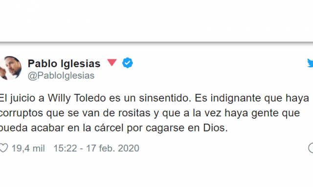 Sin embargo, de inmediato, ha surgido el vicepresidente del Gobierno, Pablo Iglesias, que ni tan siquiera le ha afeado la injuria sino que, por el contrario, presiona a los jueces para que le declaren inocente y a ser posible, le canonicen.
