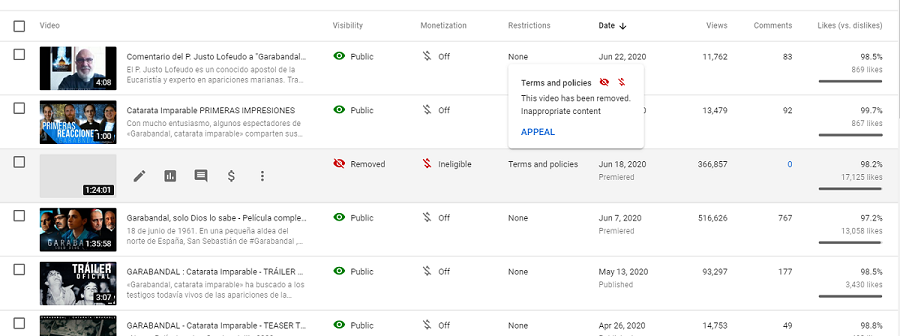 El viernes, sin previo aviso y sin permitir apelar la decisión, Youtube, que recordemos es propiedad de Alphabet (Google) retiró el video por “Contenido inapropiado”. Pueden ustedes imaginarse lo inapropiado que habrá en un documental sobre apariciones marianas en la España de los años sesenta. Pues sí, para Youtube lo hay.