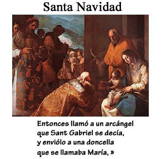 Entonces llamó a un arcángelque Sant Gabriel se decía,y enviólo a una doncellaque se llamaba María,de cuyo consentimientoel misterio se hacía,en la cual la Trinidad,de carne el verbo vestía.Y aunque tres hacen la obraen el uno se hacía,y quedó el verbo encarnadoen el vientre de María.Y el que tenía sólo Padre,ya también madre tenía,aunque no como cualquieraque de varón concebía,que de la entrañas de ellaÉl su carne recibía,por lo cual hijo de Diosy del hombre se decía. San Juan de la Cruz