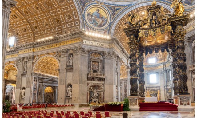 Bernini intervino, además, en la decoración del interior del ábside, como una fulgurante gloria en torno a un óculo con el símbolo del Espíritu Santo en forma de paloma, situando debajo un relicario con la Cátedra de San Pedro, sostenida por las gigantescas esculturas de cuatro grandes Padres de la Iglesia.