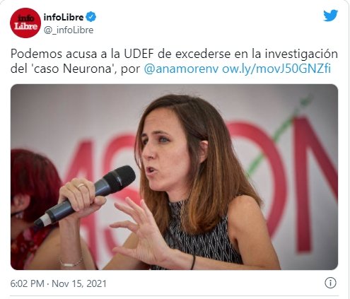 La representación legal de Podemos considera que la Unidad de Delincuencia Económica y Fiscal (UDEF) de la Policía Nacional se ha excedido en la investigación del conocido como caso Neurona, al analizar por completo un chat entre una trabajadora del partido y otro de la consultora mexicana sobre la estrategia de campaña electoral de abril de 2019 y no limitarse a examinar los vídeos que se intercambiaron y que supondrían los trabajos de campaña que habría realizado la empresa, encargos que están bajo la lupa del Juzgado de Instrucción número 42 de Madrid desde hace más de un año.