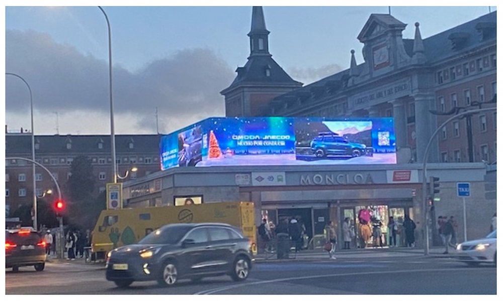 Semiocultando toda la visibilidad del antiguo Ministerio del Aire, un edificio clásico de la Moncloa madrileña, comunidad y Ayuntamiento de Madrid, que los dos tienen responsabilidad sobre ellos, han colocado, tiempo atrás, pero eso no resta sino que suma responsabilidad, un artefacto multicolor para anunciar distintos tipos de marcas, un techo de colores sobre el intercambiador de Moncloa.