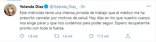 La vicepresidenta tercera Yolanda Díaz se ha visto obligada a cancelar su agenda de hoy miércoles por problemas de salud. La también ministra de Trabajo lo ha confirmado a través de sus redes sociales. “Este miércoles tenía una intensa jornada de trabajo que el médico me ha prescrito cancelar por motivos de salud. Hay días en los que nuestro cuerpo nos exige parar y que nos cuidemos para poder seguir. Espero recuperarme pronto con toda la fuerza”.