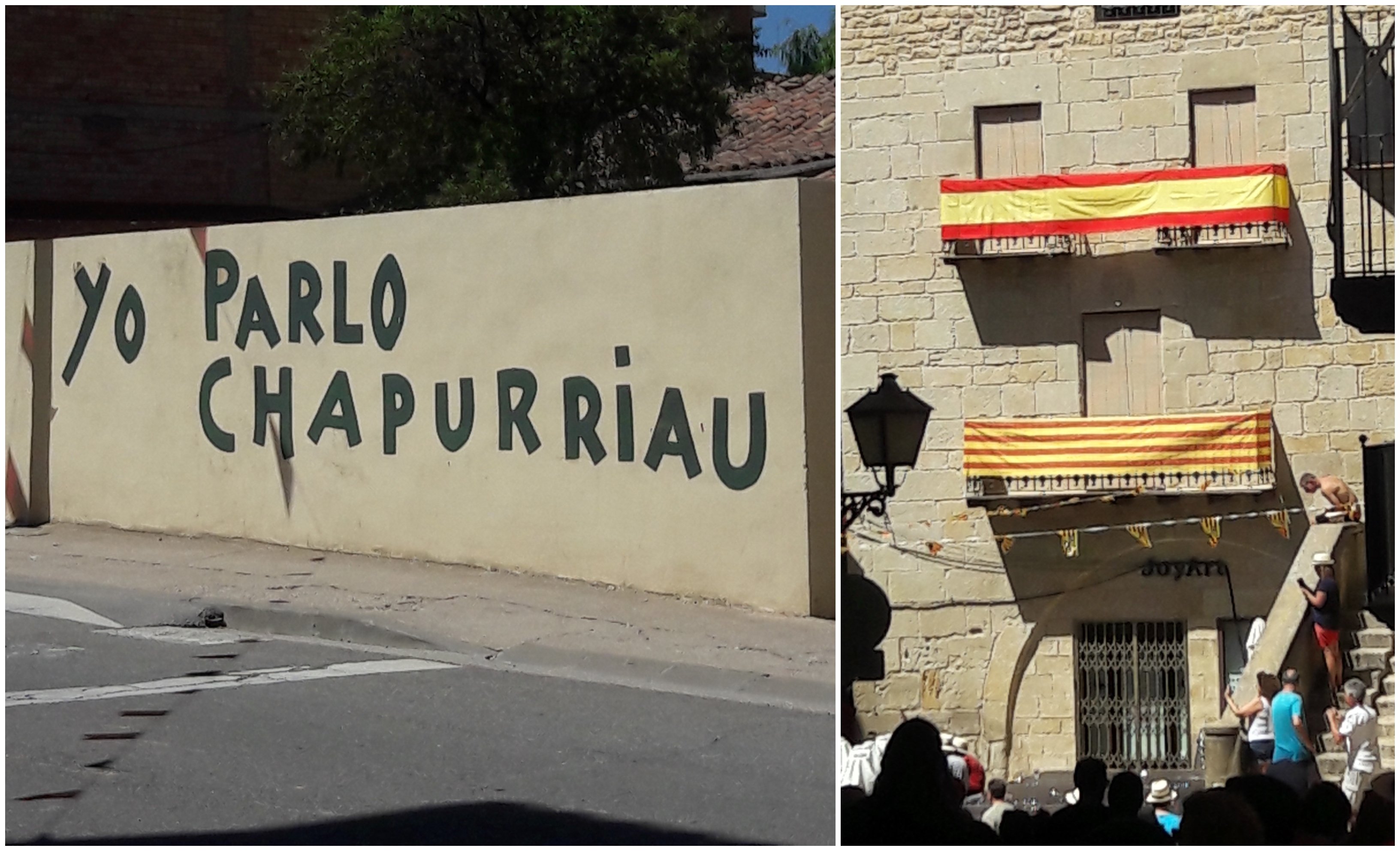 Otra muestra de convivencia y e inteligencia: Valderrobres, pueblo de frontera entre Aragón y Cataluña. Fiestas patronales: las dos banderas, la española y la catalana, conviven en las fiestas.