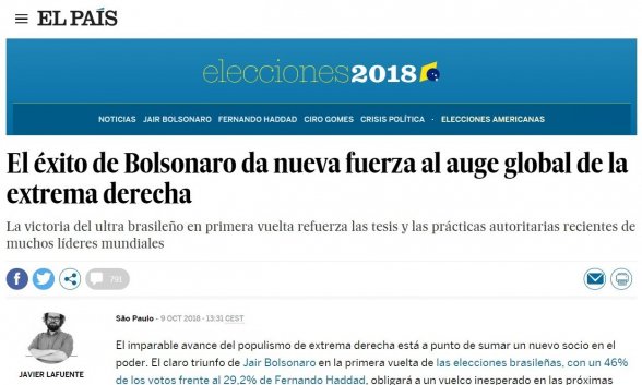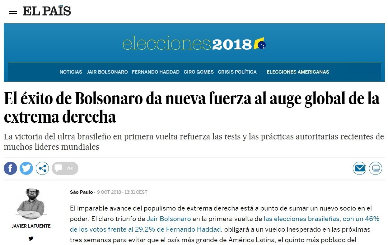 “Bolsonaro refuerza el auge mundial de la extrema derecha”, reza el titular de El País. Fíjense ustedes, el 46,6% de los brasileños han votado a Jair Bolsonaro pero Bolsonaro es un provida, así que resulta que es ultra. Y Brasil, claro está, anda plagado de ultras.