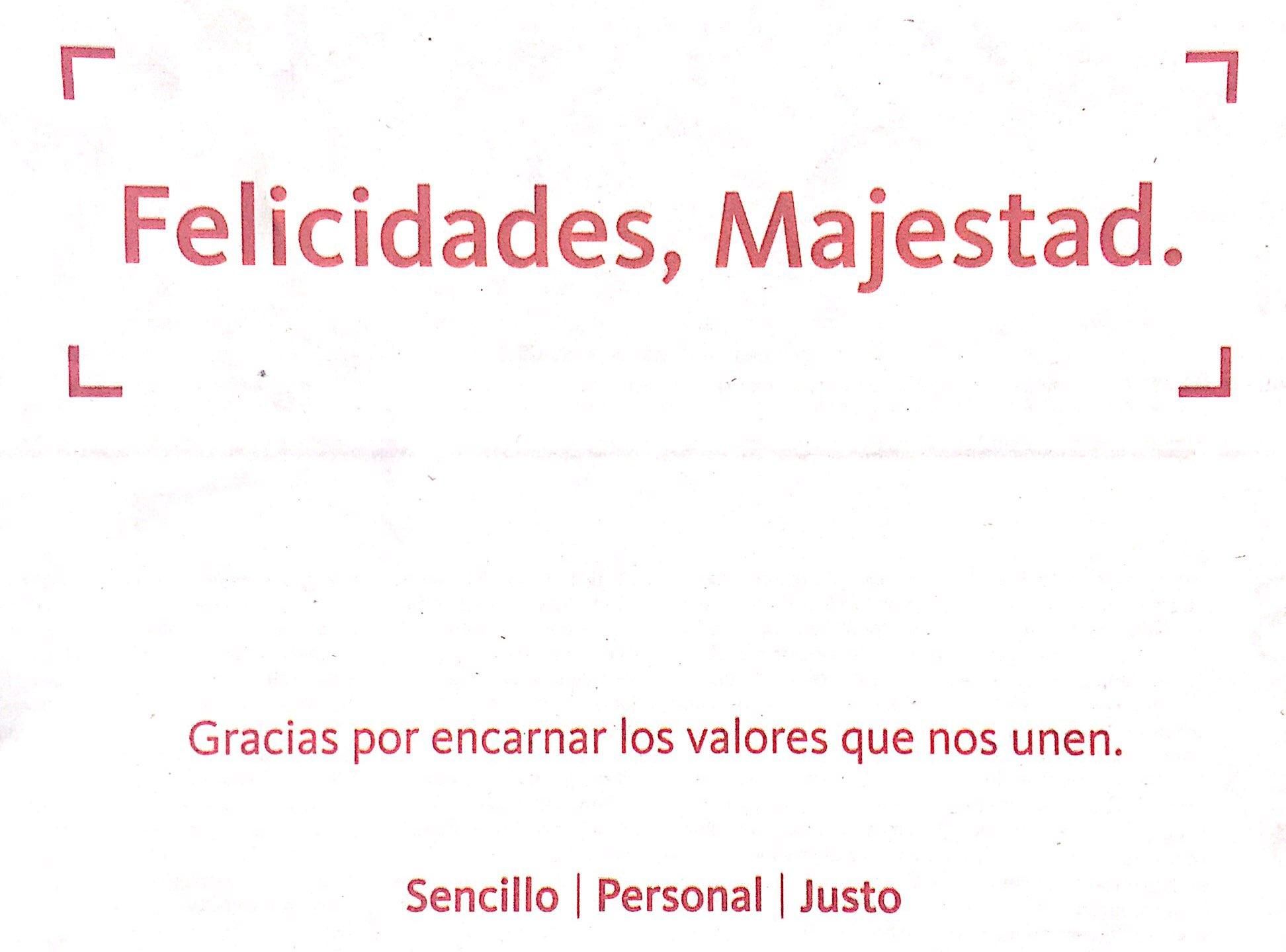 Justo sí es un valor. Lo de sencillo y personal no sabemos si se refiere al monarca o al producto estrella del Santander.Cumpleaños del rey Felipe VI. Medio siglo, para ser exactos. Una fecha que algunas empresas han aprovechado para felicitar directamente a SM a través de los diarios de tirada nacional, con mensajes a toda página -página impar, por supuesto- en los suplementos especiales publicados este martes. Por ejemplo, el Santander, después de felicitarle añade: "Gracias por encarnar los valores que nos unen. Sencillo / Personal / Justo".Vamos a ver: justo sí es un valor y, si me apuran, también lo de sencillo. Pero lo de personal, no sabemos si se refiere al monarca o a la Cuenta 1/2/3.Telefónica, Iberdrola, Globalvía e Iberia también han publicado mensajes concretos de felicitación. Precisamente, el de la aerolínea va acompañado de una imagen tomada desde el interior de un avión, en pleno vuelo. Y rápidamente, los peor pensados lo han interpretado como: Felicidades, sí, pero nosotros nos largamos de aquí volando.Hispanidadredaccion@hispanidad.com
